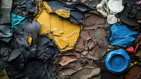 Aerial view of land covered in plastic waste contrasting natural earth tones