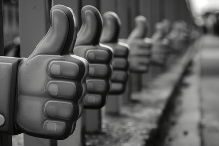 A row of thumbs are lined up on a fence. The thumbs are all pointing up, giving the impression of approval or agreement. Concept of positivity and unity