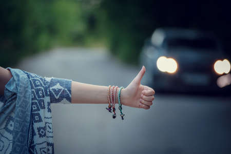 detail of a hand hitchhiking waiting to be picked up