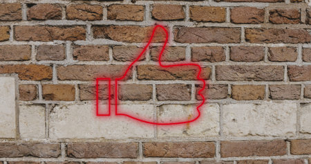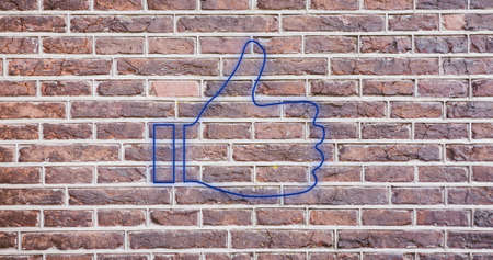 Image of glowing neon thumbs up icon on brick wall. social media and communication concept digitally generated image.