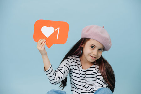 Portrait of a smiling fashionable little girl in a pink french beret holding orange like sign with a white heart, playing cute, posing for a photo in a studio. Sitting cross-legged.