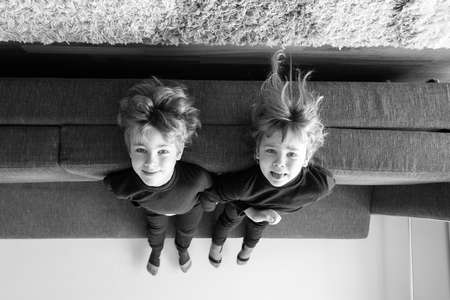 Up side down shot of two little children lying back on a couch with heads hanging down
