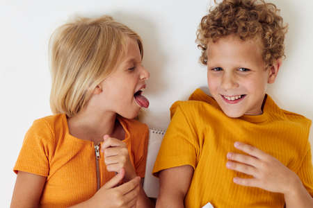 picture of positive boy and girl in yellow t-shirts standing side by side childhood emotions unaltered