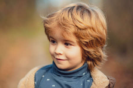 Autumn portrait of kids outdoor in park. Smiling child walking in sunny day.