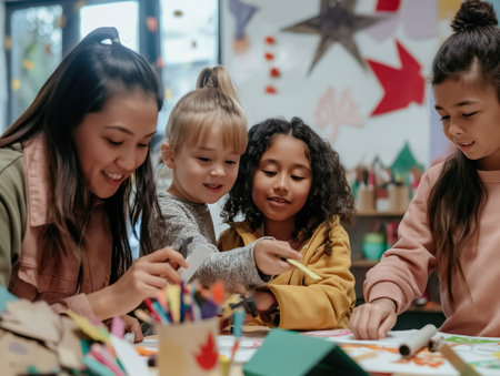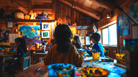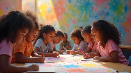 A crowd of children are gathered around a table sharing art supplies in a room with a window. They are wearing colorful tshirts, enjoying a fun leisure event AIG42E