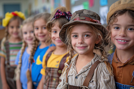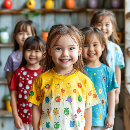 Group of young girls are smiling and wearing colorful t-shirts with fruit designs. Concept of happiness and fun, as the girls appear to be themselves enjoying and posing for a photo