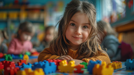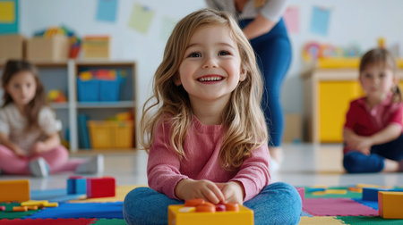 A smiling girl playing with colorful educational toys in a lively classroom, surrounded by other children engaged in learning activities.