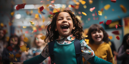 A young girl laughing heartily surrounded by colorful confetti and cheerful children at a party. A.I.