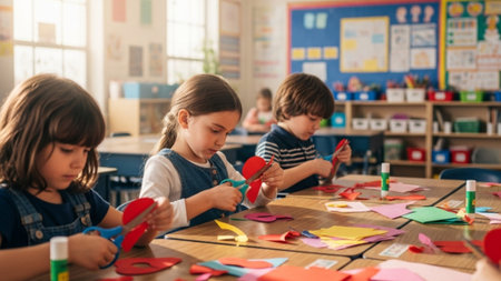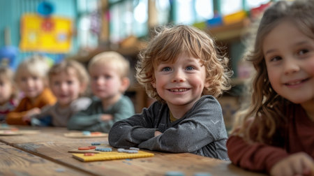 A group of children are seated around a table in a classroom, engaged in various educational activities.