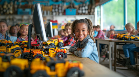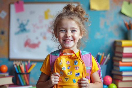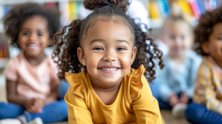 A cheerful child smiling brightly in a colorful classroom, surrounded by educational materials and happy classmates.