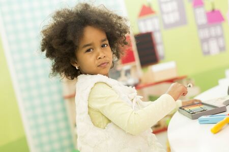 Little girl thinking about cards with different emotions at kindergarten or childcare centre. selective focus.