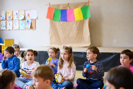 Group of kids playing musical instruments in kindergarten classroom. Selective focus