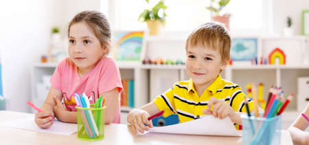 Children of different nationality study in clean white classroom. Focused boys and girls, little kids showing attention and interest while studying