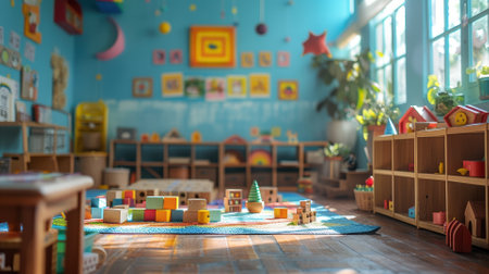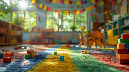 Bright and colorful playroom with scattered building blocks and toys, illuminated by natural sunlight from large windows.