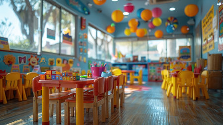 A colorful, blurred interior of a classroom with tables and chairs for children.