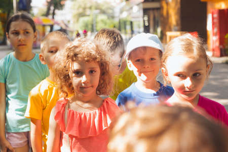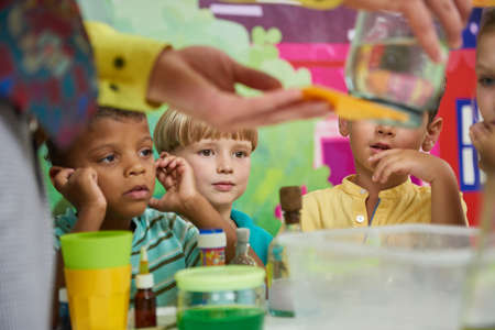 Group of curious kids watching chemistry experiment in playroom. Easy science experiments for kids.