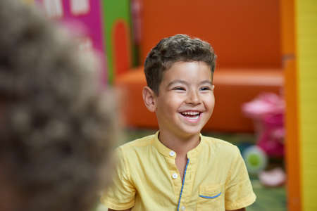 Adorable kid with beautiful smile. Portrait of joyful laughing kid. Happy child boy havig fun.