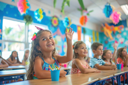 A group of children in a classroom eagerly raising their hands to participate in a learning activity. Concept back to school.