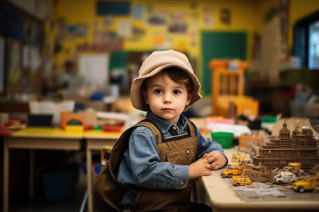 A young boy confidently stands in front of a table, ready to explore and engage with his surroundings, student in a kindergarten classroom, AI Generated