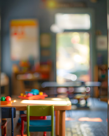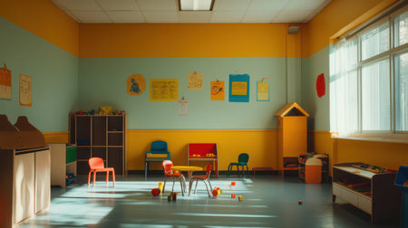 A quiet kindergarten classroom with colorful toys, tiny chairs, and artwork on the walls, no children present