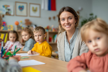 portrait of a kind male Montessori kindergarten teacher in a kindergarten with children, slight smile, candid