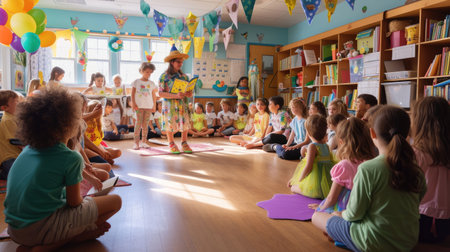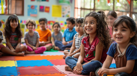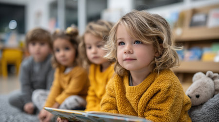 A group of young children sits attentively on a soft rug in a bright classroom, focused on a storybook. Their expressions show curiosity and excitement as they listen.