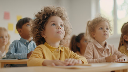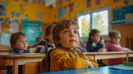 Focused young boy with bright eyes paying attention in a classroom, surrounded by classmates during a lesson.