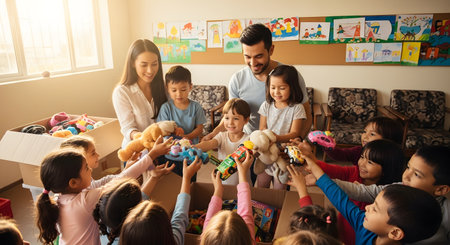 Two smiling adults, a man and a woman, are surrounded by a large group of happy children in a classroom or community center. The adults are handing out stuffed animals and toys from cardboard boxes, representing charity and donation.
