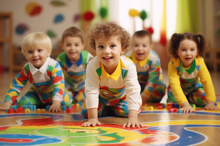 Children in kindergarten play with various toys on the floor, educational toy twister. Children's leisure in the playroom