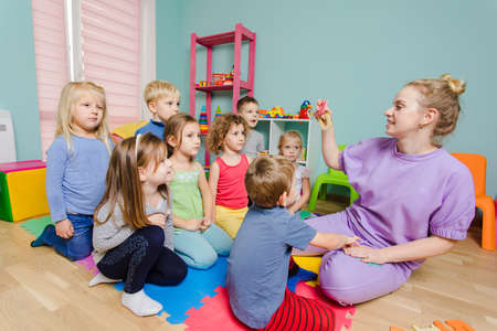 Woman educator play with children sitting on floor in kindergarten. Kids folding lego and drawing with colored pencils in playroom. Toys for kindergartners, development of thinking and intelligence