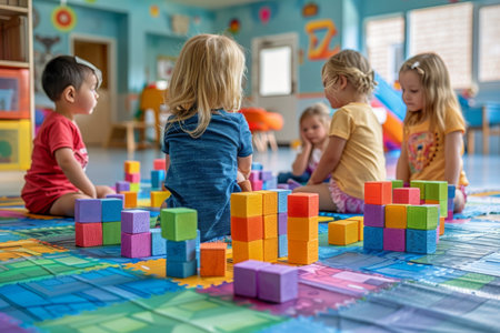 Four young children sit on a colorful floor mat and play with building blocks. They are in a brightly lit classroom setting with toys and other children in the background.