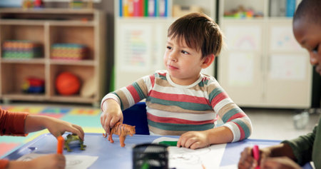 Creative, toy and drawing with boy in classroom for child development, artwork and youth. Students, academy and growth with kids playing with plastic animal for knowledge, learning and education