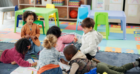 Color, floor and drawing with kids in classroom for child development, artwork and creative project. Youth, academy and growth with students at school for knowledge, learning and kindergarten