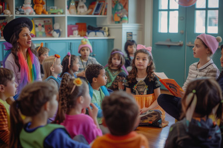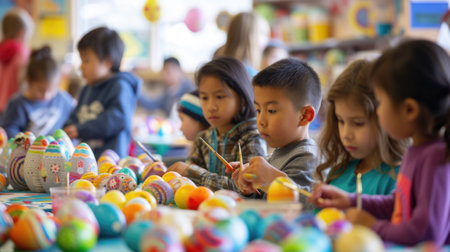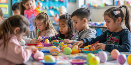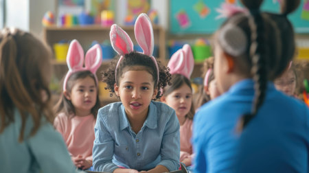 A group of young girls wearing bunny ears are sitting around a table, sharing Easter eggs and building art. The tableware on the shelf sets the scene for a fun and leisurely event in the room AIG42E