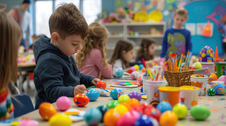 A toddler is sitting at a table happily painting Easter eggs, showcasing his adaptation skills and having fun in a leisure activity. His smile shows he is enjoying the recreation time AIG42E