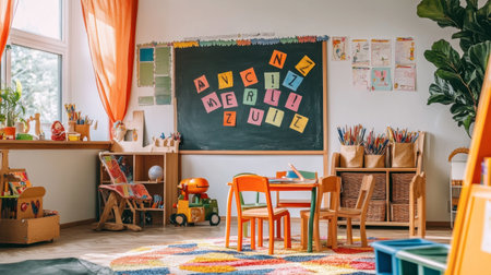 A vibrant classroom designed for young learners, featuring colorful furniture, a chalkboard, and a playful atmosphere that fosters creativity and engagement.