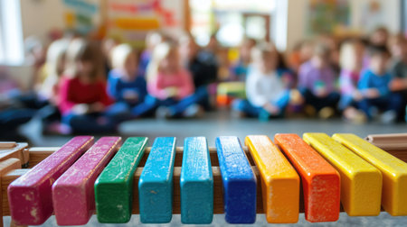 A vibrant xylophone welcomes a joyful classroom scene where children engage in music education, fostering creativity and collaboration in a bright learning environment.