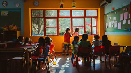 A group of young children engage in various activities in a brightly lit classroom with colorful furniture and large windows.