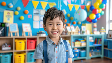 A young boy with a bright smile stands in a colorful classroom, surrounded by toys and learning materials.