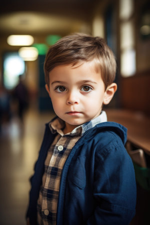 A young boy confidently stands in front of a table, ready to explore and engage with his surroundings, student in a kindergarten classroom, AI Generated