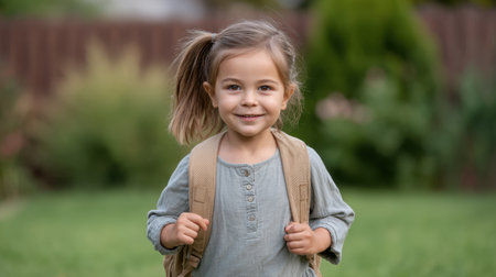 A cheerful young girl with a backpack smiles brightly in an outdoor setting, embodying the spirit of joy and eagerness for school adventures ahead.