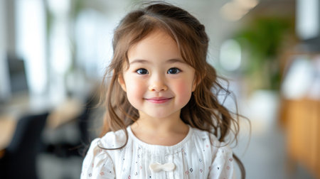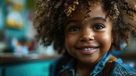A joyful young girl with curly hair smiles brightly in a lively setting, embodying happiness and innocence, perfect for educational or community themes.
