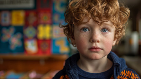 Portrait of a young boy with striking blue eyes and curly red hair, standing in a classroom with colorful educational toys in the background.