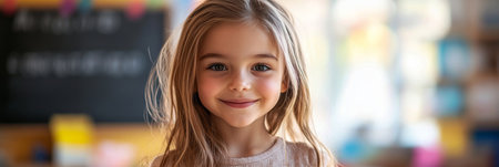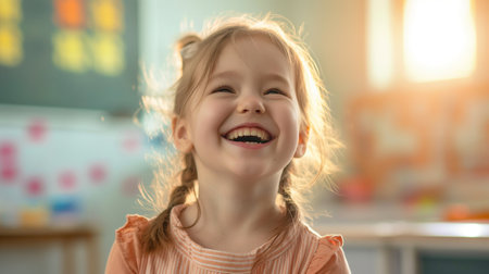 A cheerful young girl with long hair stands in a vibrant classroom. Sunlight streams in, highlighting her smile and the cheerful environment around her.