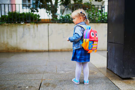 Adorable toddler girl with funny backpack ready to go to daycare, kindergarten or school. First day of school concept