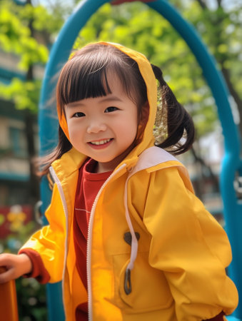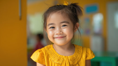 A young girl with a joyful expression stands in a vibrant preschool setting. She wears a cheerful yellow dress and radiates happiness while engaging with her surroundings.