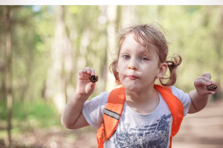 Girl showing tongue and bumps walking through the woods. High quality photo