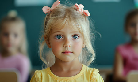 Blonde Caucasian girl with blue eyes and pink bows in her hair sits in a classroom, facing forward with a calm, curious expression.