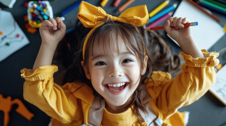 A young girl in a yellow dress is smiling and holding a pencil. Concept of joy and playfulness, as the girl appears to be having fun while engaging in an activity