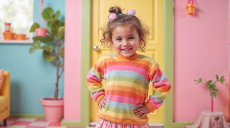Cheerful young girl stands confidently in her colorful bedroom, wearing vibrant, tiered dress. Room features pastel decorations, patterned bedspread, and bright accents that enhance playful atmosphere